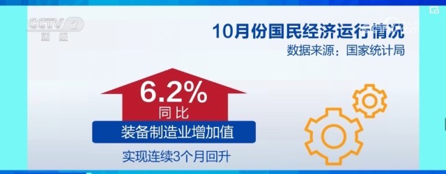 10月份,全國規(guī)模以上工業(yè)增加值比上月加快0.1個(gè)百分點(diǎn)。其中,裝備制造業(yè)增加值同比增長(zhǎng)6.2%,比上月加快0.7個(gè)百分點(diǎn),連續(xù)3個(gè)月回升。