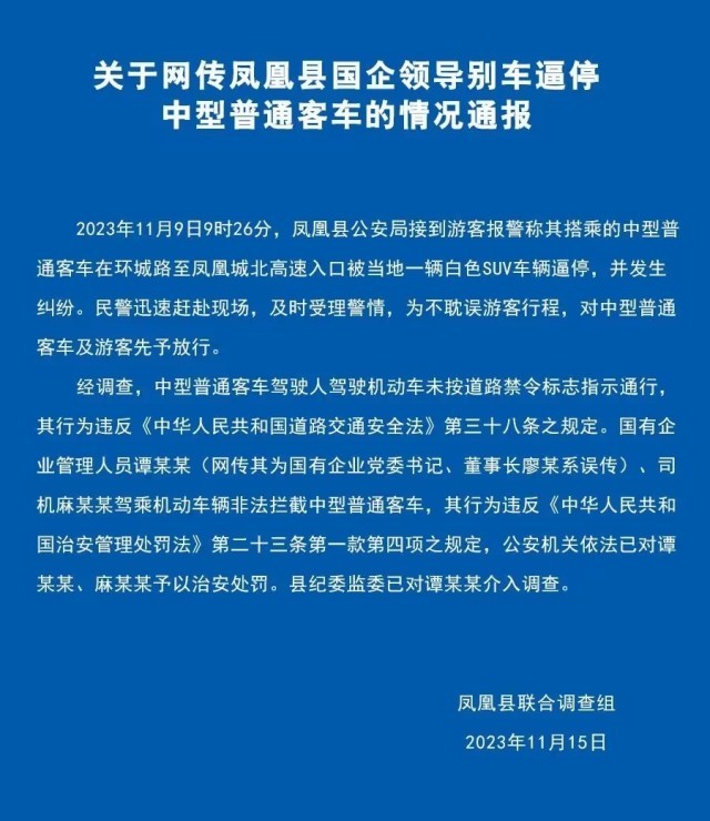 央視網(wǎng)消息:據(jù)鳳凰融媒微信公眾號(hào)消息,11月15日,鳳凰縣聯(lián)合調(diào)查組發(fā)布情況通報(bào),經(jīng)調(diào)查,中型普通客車駕駛?cè)笋{駛機(jī)動(dòng)車未按道路禁令標(biāo)志指示通行,其行為違反相關(guān)規(guī)定。國有企業(yè)管理人員譚某某 (網(wǎng)傳其為國有企業(yè)黨委書記、董事長(zhǎng)廖某系誤傳)、司機(jī)麻某某駕乘機(jī)動(dòng)車輛非法攔截中型普通客車,其行為違反相關(guān)規(guī)定,公安機(jī)關(guān)依法已對(duì)譚某某、麻某某予以治安處罰??h紀(jì)委監(jiān)委已對(duì)譚某某介入調(diào)查。