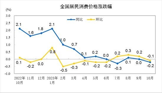 國家統(tǒng)計局數(shù)據(jù)顯示,2023年10月,全國CPI環(huán)比下降0.1%,同比下降0.2%,同比時隔兩個月后再度出現(xiàn)負增長。