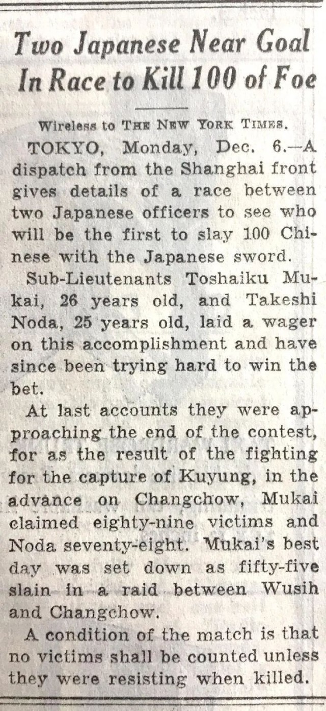 在1937年12月6日發(fā)行的《紐約時報》中,也登載了有關(guān)日軍“百人斬”殺人競賽的報道。報道稱,來自上海前線的一份電報詳細介紹了兩名日本軍官之間的一場比賽,看誰先殺死100名中國人。年紀(jì)分別為25歲和26歲的日本軍官把賭注壓在了這項“成就”上。