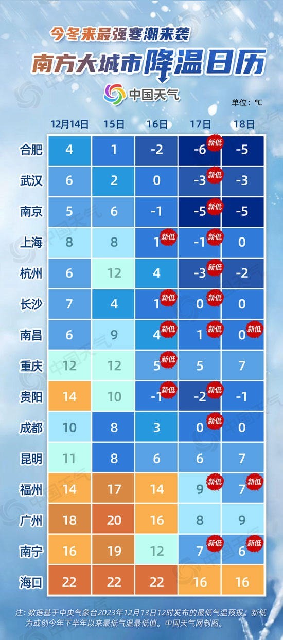 從中國天氣網(wǎng)推出的南方大城市降溫日歷來看,未來五天,合肥、武漢、南京、上海、杭州、貴陽最低氣溫都將逐步下降到冰點以下。南昌16日至18日最低氣溫或連創(chuàng)新低,貴陽最低氣溫將從14℃降至-2℃,降幅可達16℃。