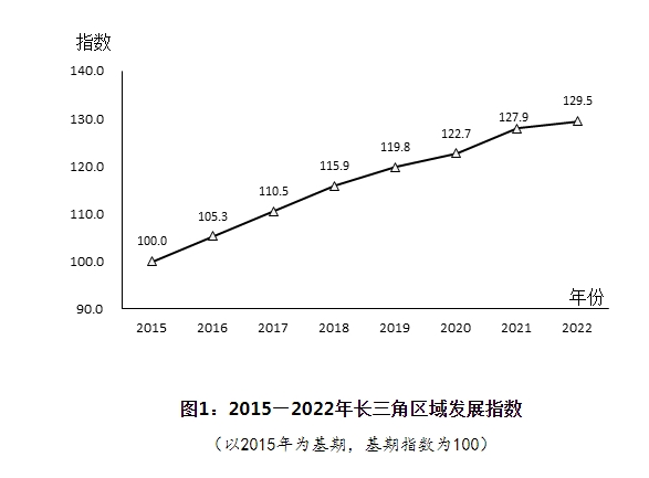 從測算結(jié)果看,以2015年為基期,2022年長三角區(qū)域發(fā)展指數(shù)為129.5,比上年提高1.6,年均提高4.2。