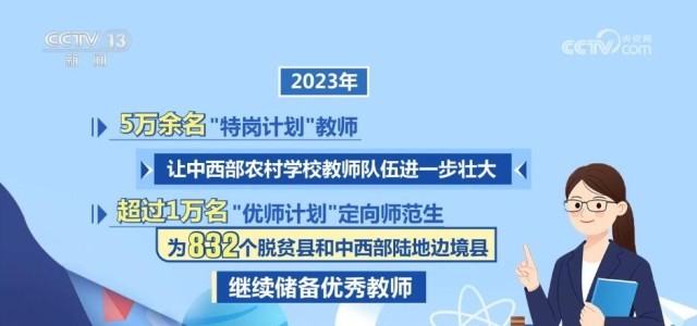 強教必先強師。2023年,5萬余名“特崗計劃”教師讓中西部農村學校教師隊伍進一步壯大,超過1萬名“優(yōu)師計劃”定向師范生為832個脫貧縣和中西部陸地邊境縣繼續(xù)儲備優(yōu)秀教師。