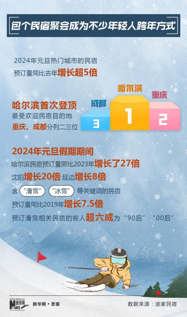 2024年元旦,民宿成為冰雪旅游一大熱詞。2024年元旦熱門城市的民宿,預(yù)訂量同比2023年增長超5倍。北方民宿更是強(qiáng)勢崛起,哈爾濱首次登頂最受歡迎民宿目的地。