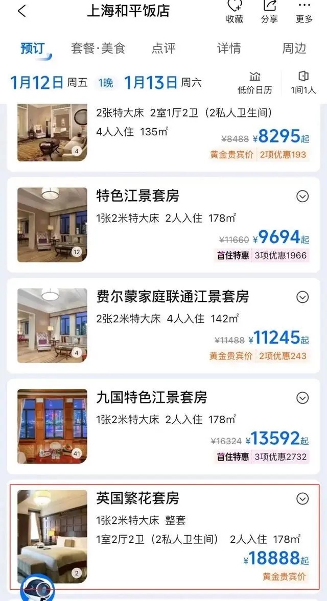 劇中出鏡率極高的和平飯店英國套房也成了“熱門產(chǎn)品”。目前,和平飯店英國套房在旅游平臺(tái)上被命名為“英國繁花套房”。9日查詢攜程旅行平臺(tái)發(fā)現(xiàn),9-11日該套房已售罄,12日入住一晚的價(jià)格為18888元。據(jù)媒體此前報(bào)道,這一套房在今年春節(jié)期間含早價(jià)為22888元一晚。