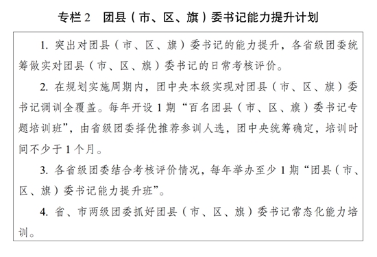 ?。ǘ┩怀觥瓣P(guān)鍵少數(shù)”政治訓(xùn)練。堅(jiān)持把政治訓(xùn)練貫穿團(tuán)干部成長(zhǎng)全周期,使團(tuán)干部的政治素養(yǎng)、政治能力與擔(dān)負(fù)的領(lǐng)導(dǎo)職責(zé)相匹配。強(qiáng)化“一把手”政治培訓(xùn),有計(jì)劃地選調(diào)團(tuán)的各級(jí)領(lǐng)導(dǎo)機(jī)關(guān)主要負(fù)責(zé)同志到團(tuán)干部教育培訓(xùn)機(jī)構(gòu)參加專題培訓(xùn)。強(qiáng)化對(duì)團(tuán)縣(市、區(qū)、旗)委書記這一群體的培訓(xùn),實(shí)施團(tuán)縣(市、區(qū)、旗)委書記能力提升計(jì)劃(專欄2)。突出對(duì)團(tuán)的領(lǐng)導(dǎo)機(jī)關(guān)干部的政治訓(xùn)練,各級(jí)團(tuán)的領(lǐng)導(dǎo)機(jī)關(guān)加強(qiáng)對(duì)機(jī)關(guān)干部的常態(tài)化政治能力培訓(xùn)。加強(qiáng)對(duì)青年人才的政治引領(lǐng),團(tuán)中央組織部會(huì)同有關(guān)單位每年組織一定數(shù)量青年人才開展國(guó)情研修。積極推動(dòng)將地方團(tuán)的領(lǐng)導(dǎo)機(jī)關(guān)班子成員培訓(xùn)納入地方黨委組織開展的干部政治理論培訓(xùn)范疇。