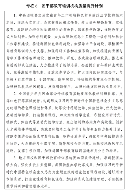 ?。ㄒ唬┡嘤?xùn)機(jī)構(gòu)建設(shè)。加強(qiáng)團(tuán)干部教育培訓(xùn)機(jī)構(gòu)規(guī)范管理和質(zhì)量提升,推進(jìn)各級(jí)團(tuán)校、團(tuán)干部教育培訓(xùn)基地建設(shè),構(gòu)建以中央團(tuán)校、全國(guó)青少年井岡山革命傳統(tǒng)教育基地為龍頭,各級(jí)團(tuán)校、團(tuán)干部教育培訓(xùn)基地相互補(bǔ)充、布局合理、規(guī)范有序的培訓(xùn)機(jī)構(gòu)體系,強(qiáng)化中央團(tuán)校對(duì)地方團(tuán)校的業(yè)務(wù)指導(dǎo),不斷提高辦學(xué)水平。加強(qiáng)各類團(tuán)干部教育培訓(xùn)機(jī)構(gòu)規(guī)范管理,開展團(tuán)干部教育培訓(xùn)機(jī)構(gòu)辦學(xué)質(zhì)量評(píng)估。支持各地各級(jí)團(tuán)組織聯(lián)合開展培訓(xùn),鼓勵(lì)團(tuán)干部教育培訓(xùn)機(jī)構(gòu)開展區(qū)域協(xié)作交流,推動(dòng)優(yōu)質(zhì)培訓(xùn)資源共建共享。實(shí)施團(tuán)干部教育培訓(xùn)機(jī)構(gòu)質(zhì)量提升計(jì)劃(專欄6)。