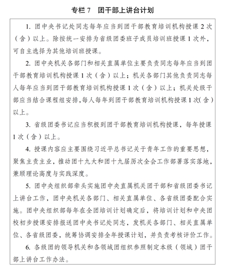 ?。ǘ熧Y隊(duì)伍建設(shè)。加大名師培養(yǎng)引進(jìn)力度,把團(tuán)干部教育培訓(xùn)師資納入各級(jí)青年人才政策支持范疇,努力造就一批對(duì)黨忠誠(chéng)、精通黨的創(chuàng)新理論、授課水平高、在學(xué)科領(lǐng)域有影響力的知名教師。加強(qiáng)師資隊(duì)伍黨性教育和業(yè)務(wù)培訓(xùn),完善專職教師通過(guò)列席會(huì)議、基層調(diào)研、掛職鍛煉等方式促進(jìn)知識(shí)更新、加深理論研究。通過(guò)“名師帶徒”等方式,加強(qiáng)中青年骨干教師培養(yǎng)。大力推進(jìn)團(tuán)干部上講臺(tái),實(shí)施團(tuán)干部上講臺(tái)計(jì)劃(專欄7)。注重在領(lǐng)導(dǎo)干部、先進(jìn)青年典型、優(yōu)秀基層團(tuán)干部中遴選培養(yǎng)師資。分級(jí)建設(shè)師資庫(kù)。探索建立符合團(tuán)干部教育培訓(xùn)特點(diǎn)的師資隊(duì)伍考核評(píng)價(jià)體系。