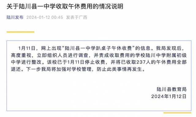 央視網(wǎng)消息:據(jù)“陸川發(fā)布”公眾號(hào)消息,1月12日,廣西陸川縣教育局通報(bào)關(guān)于一中學(xué)收取午休費(fèi)用的情況說(shuō)明:1月11日,網(wǎng)上出現(xiàn)“陸川縣一中學(xué)趴桌子午休收費(fèi)”的信息,教育局立即組織人員進(jìn)行調(diào)查,并責(zé)成收取費(fèi)用的學(xué)校陸川中學(xué)附屬初級(jí)中學(xué)進(jìn)行整改。該校已于1月11日停止收費(fèi),并將已收取237人的午休費(fèi)用全部退還。下一步將加強(qiáng)對(duì)學(xué)校管理,防止此類(lèi)事情再發(fā)生。