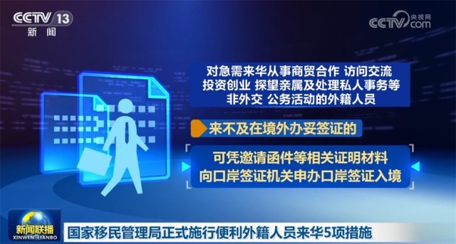 5項新舉措主要包括:放寬來華外籍人員申辦口岸簽證條件。對急需來華從事商貿(mào)合作、訪問交流、投資創(chuàng)業(yè)、探望親屬及處理私人事務等非外交、公務活動的外籍人員,來不及在境外辦妥簽證的,可憑邀請函件等相關證明材料向口岸簽證機關申辦口岸簽證入境。