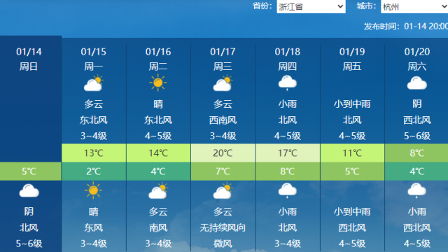 像是杭州,今天最高氣溫22.6℃,剛刷新當(dāng)?shù)?月中旬最高氣溫紀(jì)錄,明天氣溫陡降,雖預(yù)報(bào)最高氣溫14℃,但今晚開始?xì)鉁氐钩?,?shí)際明天下午最高氣溫將不足10℃,17日氣溫再度升至20℃,大幅偏高,20日又降至8℃。