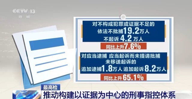對(duì)不構(gòu)成犯罪或證據(jù)不足的依法不批捕19.2萬(wàn)人、不起訴4.2萬(wàn)人;對(duì)應(yīng)當(dāng)逮捕、應(yīng)當(dāng)起訴而未提請(qǐng)批捕、未移送起訴的,追加逮捕1.8萬(wàn)人、追加起訴8.2萬(wàn)人,同比分別上升7.6%和65.1%。