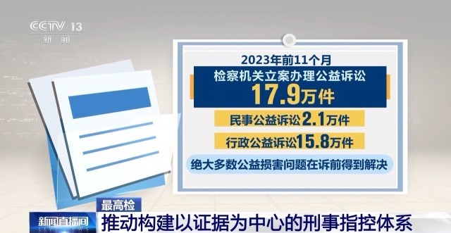 2023年前11個(gè)月,檢察機(jī)關(guān)立案辦理公益訴訟17.9萬(wàn)件,其中民事公益訴訟2.1萬(wàn)件、行政公益訴訟15.8萬(wàn)件。絕大多數(shù)公益損害問(wèn)題在訴前得到解決。