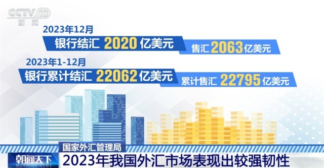 國(guó)家外匯管理局最新數(shù)據(jù)顯示,2023年12月,銀行結(jié)匯2020億美元,售匯2063億美元。2023年1—12月,銀行累計(jì)結(jié)匯22062億美元,累計(jì)售匯22795億美元。