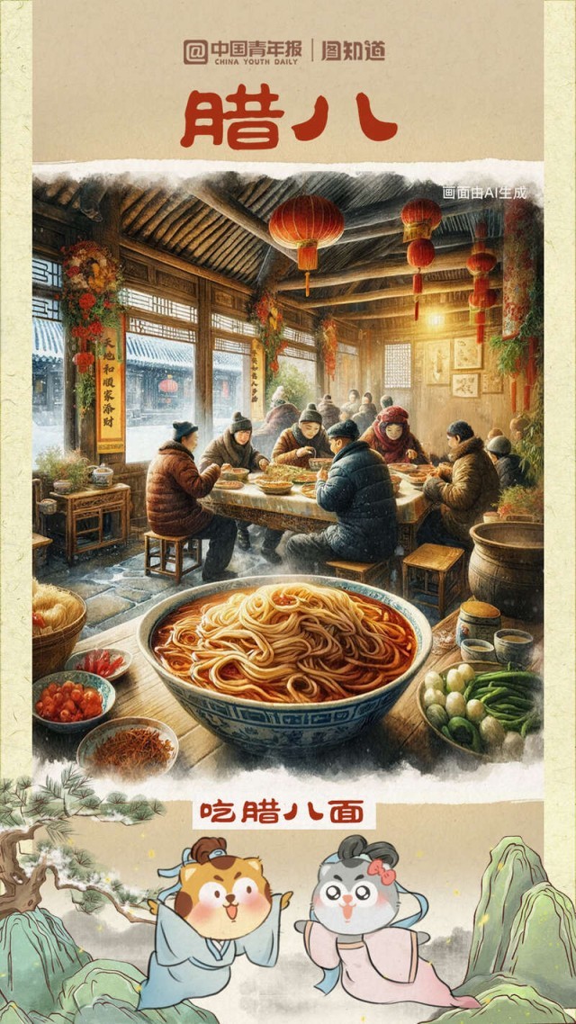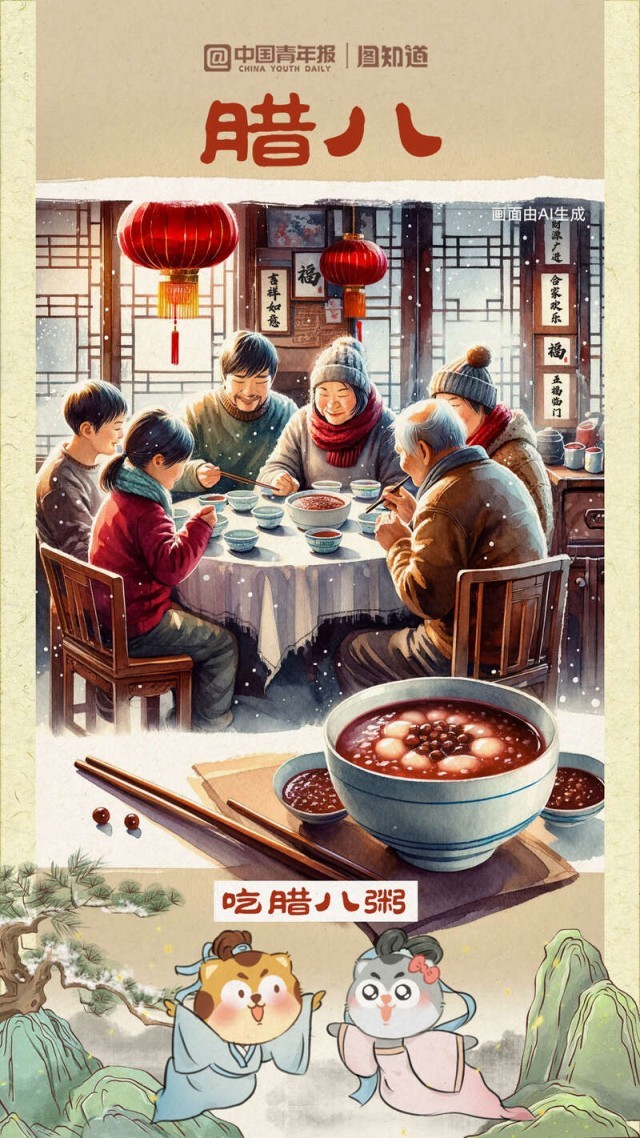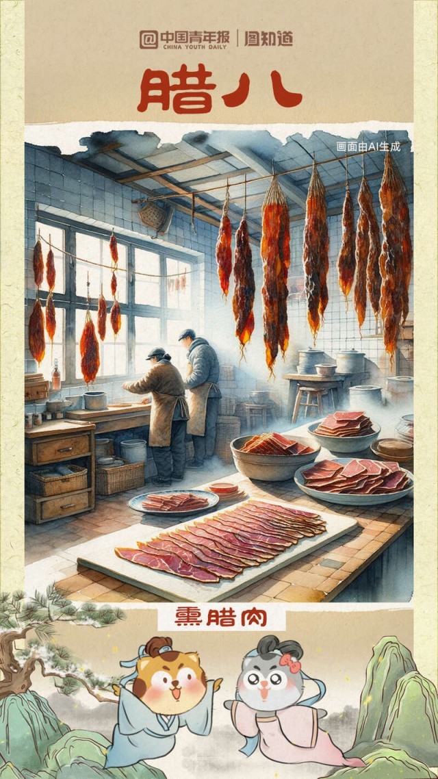 又是一年臘八時,道一聲萬事“粥”全?!坝煤?、松子、乳蕈、柿、栗之類為粥,謂之‘臘八粥’?!边@是南宋周密筆下的臘八粥。你的“臘八”餐桌想擺上哪些地方的美食?①湖南湖北的熏臘肉②北方地區(qū)的臘八蒜、臘八醋③陜西關(guān)中地區(qū)臘八面……過了臘八就是年,幾幅臘八美食與你一起迎接小年。