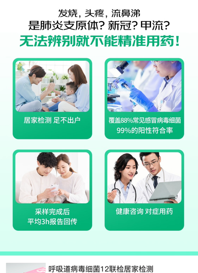 “一次檢測,覆蓋92種常見病原體和11種耐藥基因……”相比之下,有機構推出的呼吸道病原體居家檢測似乎更加“高大上”。從介紹來看,檢測內容包含甲流、乙流等30種RNA病毒、肺炎支原體等5種非典型病原體、煙曲霉等10種真菌、腺病毒等9種DNA病毒和百日咳鮑特菌等38種細菌,費用高達998元。