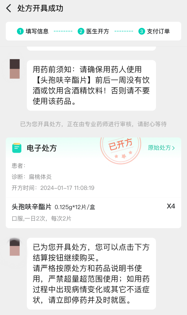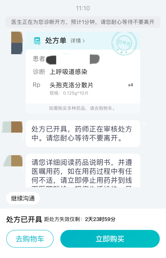 “您好,我是醫(yī)生XX,已收到您的復診開藥訴求,正在為您診斷開方,預計1分鐘,請不要離開……”自動發(fā)來三條問話后,記者并未回復任何信息,一份電子處方就順利開出。只需完成支付,處方藥就可以送貨上門。