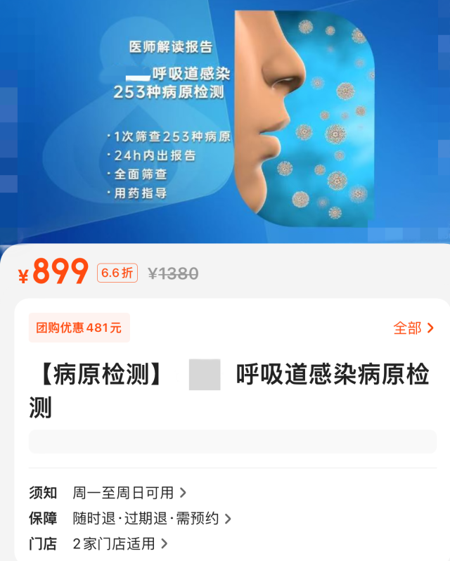 事實上,這并非種類最多的檢測方案。記者在調查中發(fā)現,有機構推出的呼吸道感染病原檢測一次篩查病原多達253種,原價1380元,折后也要899元。