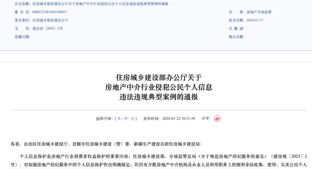 1月22日上午,住建部官網(wǎng)通報了5起房地產(chǎn)中介行業(yè)侵犯公民個人信息違法違規(guī)典型案例: