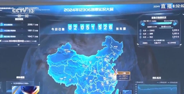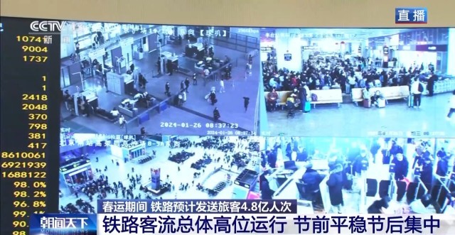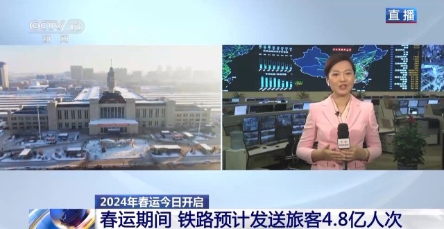 總臺央視記者 陳晰:40天春運(yùn),全國鐵路預(yù)計發(fā)送旅客4.8億人次,日均1200萬人次。今天是春運(yùn)首日,全國鐵路預(yù)計發(fā)送旅客1060萬人次。2024年春運(yùn)的火車票預(yù)售已經(jīng)從1月12日開始發(fā)售,從目前的售票情況來看,旅客出行需求旺盛。