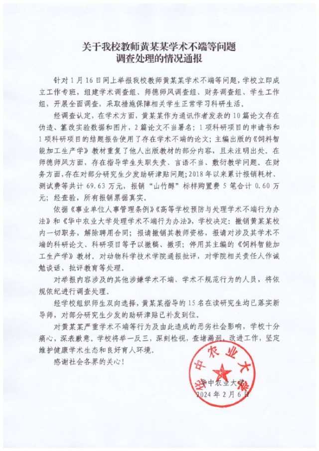 華中農(nóng)業(yè)大學(xué)通報(bào):教師黃某某學(xué)術(shù)不端等問題調(diào)查處理的情況