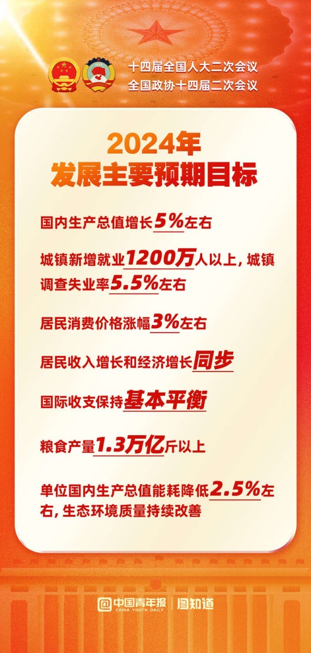 國(guó)內(nèi)生產(chǎn)總值增長(zhǎng)5%左右,城鎮(zhèn)新增就業(yè)1200萬人以上,糧食產(chǎn)量1.3萬億斤以上......2024年發(fā)展主要預(yù)期目標(biāo)公布,向著這些目標(biāo)共同奮斗!