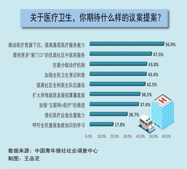 每年全國兩會,醫(yī)療衛(wèi)生都是代表委員們熱議的話題。在全國兩會召開前夕,中國青年報社社會調(diào)查中心聯(lián)合問卷網(wǎng)(wenjuan.com),進(jìn)行了全國兩會青年期待調(diào)查,共有2002人參與。調(diào)查顯示,在兩會關(guān)于醫(yī)療衛(wèi)生領(lǐng)域的議題中,56.9%的受訪者最期待推動醫(yī)療資源下沉,提高基層醫(yī)療服務(wù)能力,47.5%的受訪者期待提供更多“家門口”的優(yōu)質(zhì)社區(qū)中醫(yī)藥服務(wù)。