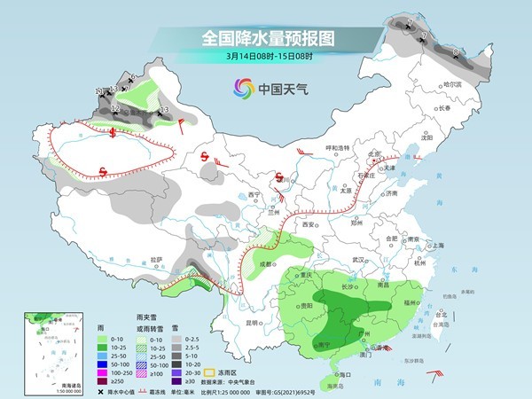 降水方面,昨天,南方陰雨天氣再度發(fā)展增多,同時(shí)新疆、西藏等地出現(xiàn)降雪,監(jiān)測(cè)顯示,新疆北部、青海東南部等地部分地區(qū)出現(xiàn)小到中雪或雨夾雪,新疆伊犁、博州等地局地降水量6~7毫米;廣西東北部和南部、廣東北部、湖南西南部等地部分地區(qū)出現(xiàn)中到大雨。