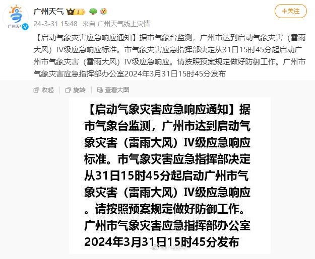 央視網(wǎng)消息:據(jù)廣州天氣 消息,據(jù)廣州市氣象臺監(jiān)測,廣州市達到啟動氣象災(zāi)害(雷雨大風)Ⅳ級應(yīng)急響應(yīng)標準。市氣象災(zāi)害應(yīng)急指揮部決定從31日15時45分起啟動廣州市氣象災(zāi)害(雷雨大風)Ⅳ級應(yīng)急響應(yīng)。請按照預(yù)案規(guī)定做好防御工作。