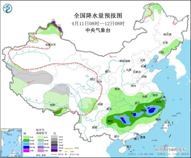 4月11日08時(shí)至12日08時(shí),新疆北疆北部、內(nèi)蒙古東北部、黑龍江西北部、西藏西部和中北部、青海南部、川西高原等地部分地區(qū)有小到中雪或雨夾雪,其中,新疆北疆北部高海拔地區(qū)有大到暴雪,局地大暴雪(20~25毫米)。貴州東部、廣西北部、江南大部的部分地區(qū)有中到大雨,其中,湖南東部和西南部、廣西北部、江西東北部、浙江西南部、福建西北部等地部分地區(qū)有暴雨或大暴雨(100~120毫米)。內(nèi)蒙古西北部、西藏西部等地部分地區(qū)有4~5級(jí)風(fēng)。