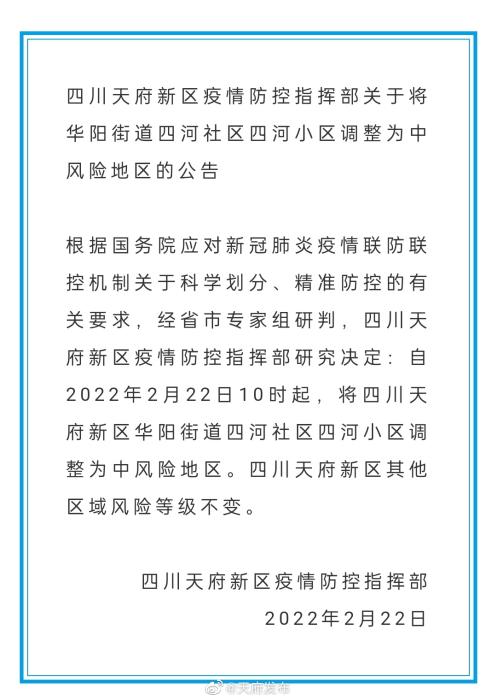 中新網(wǎng)2月22日電 據(jù)“天府發(fā)布”微博消息,四川天府新區(qū)疫情防控指揮部發(fā)布關于將華陽街道四河社區(qū)四河小區(qū)調(diào)整為中風險地區(qū)的公告:
