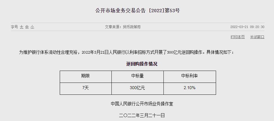 央行開展300億元7天期逆回購操作,中標利率2.10%