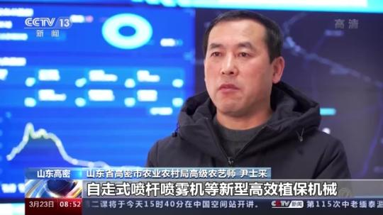 山東省高密市農(nóng)業(yè)農(nóng)村局高級(jí)農(nóng)藝師 尹士采:我們利用植保無(wú)人機(jī)、自走式噴桿噴霧機(jī)等新型高效植保機(jī)械,開展小麥病蟲草害統(tǒng)防統(tǒng)治,同時(shí)加強(qiáng)對(duì)農(nóng)戶、家庭農(nóng)場(chǎng)的指導(dǎo)服務(wù)。