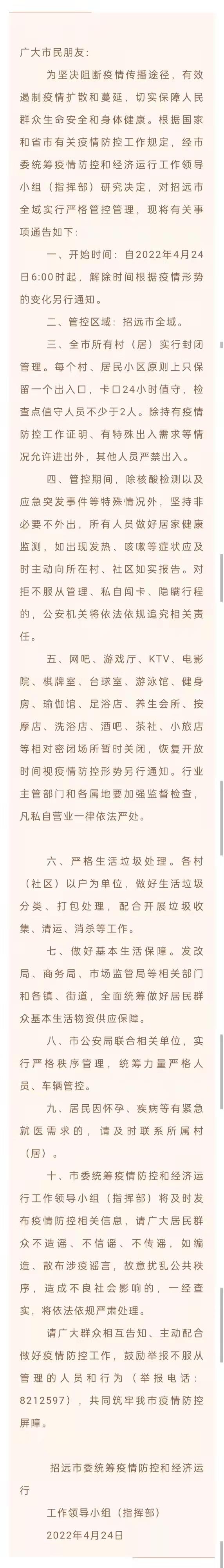 4月24日,山東煙臺招遠市委統(tǒng)籌疫情防控和經(jīng)濟運行工作領(lǐng)導(dǎo)小組(指揮部)發(fā)布《關(guān)于全域?qū)嵤﹪?yán)格管控管理的通告》。通告指出,自2022年4月24日6時起,招遠市所有村(居)實行封閉管理。每個村、居民小區(qū)原則上只保留一個出入口,卡口24小時值守,檢查點值守人員不少于2人。除持有疫情防控工作證明、有特殊出入需求等情況允許進出外,其他人員嚴(yán)禁出入。