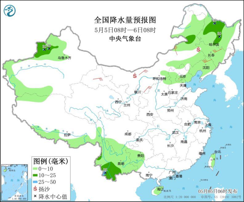 5月5日8時至6日8時,新疆西北部、內(nèi)蒙古東部、華北中北部、東北地區(qū)大部、西南地區(qū)南部等地的部分地區(qū)有小到中雨,局地有大雨。甘肅河西、內(nèi)蒙古、東北地區(qū)等地有5~7級風(fēng),部分地區(qū)并伴有浮塵或揚(yáng)沙天氣。渤海、渤海海峽、黃海北部和中西部海域?qū)⒂?~7級、陣風(fēng)8級的偏南風(fēng)轉(zhuǎn)東北風(fēng)。