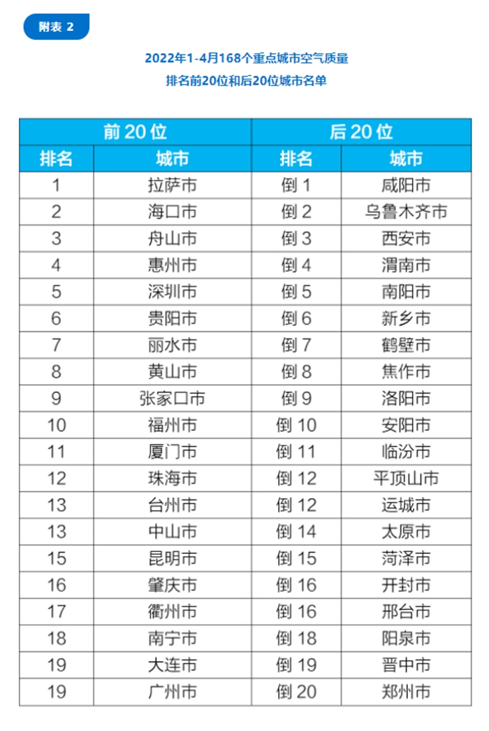 1—4月,168個(gè)重點(diǎn)城市中,拉薩、??诤椭凵绞械?0個(gè)城市空氣質(zhì)量相對(duì)較好;咸陽(yáng)、烏魯木齊和西安市等20個(gè)城市空氣質(zhì)量相對(duì)較差。(完)