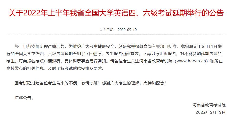 河南省全國大學(xué)英語四、六級(jí)考試延期至9月17日