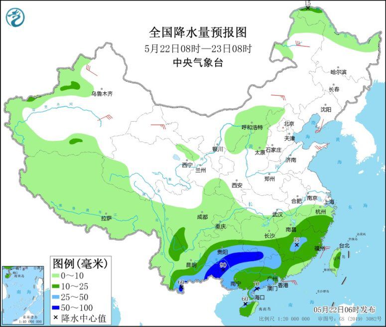 5月22日08時至23日08時,西藏、青海西南部等地有小雨或陣雨,高海拔地區(qū)有小到中雪或雨夾雪;江南東部和南部、華南大部、貴州中南部、云南南部、黑龍江西北部等地部分地區(qū)有中到大雨,其中,云南南部、貴州南部、廣西北部、湖南南部、廣東西南部沿海等地部分地區(qū)有暴雨(50~90毫米)。新疆北部和南疆東部、甘肅北部、內蒙古西部和東部等地部分地區(qū)有4~6級風。