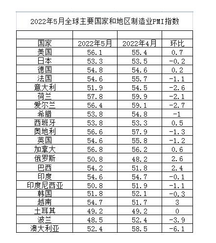 中國物流與采購聯(lián)合會(huì)網(wǎng)站發(fā)布的2022年5月份全球主要國家制造業(yè)PMI指數(shù)截圖。