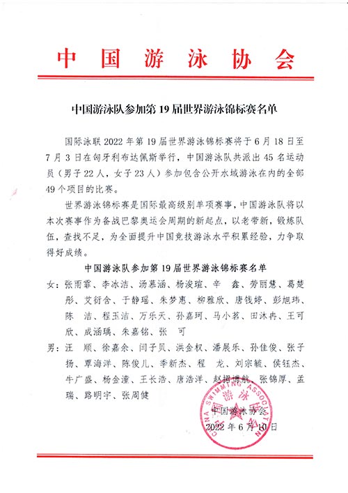 中新網(wǎng)客戶端北京6月10日電 6月10日,中國游泳協(xié)會網(wǎng)站公布了中國游泳隊參加國際泳聯(lián)2022年第19屆世界游泳錦標賽名單,奧運冠軍張雨霏、汪順領銜出戰(zhàn)。