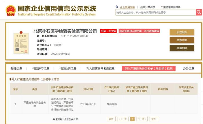 北京樸石醫(yī)學(xué)檢驗實驗室被列為嚴(yán)重違法失信企業(yè)