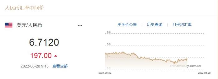 中新財(cái)經(jīng)6月20日電 中國(guó)人民銀行授權(quán)中國(guó)外匯交易中心公布,2022年6月20日銀行間外匯市場(chǎng)人民幣匯率中間價(jià)為:1美元對(duì)人民幣6.7120元。這較上一交易日下調(diào)197個(gè)基點(diǎn)。(完)