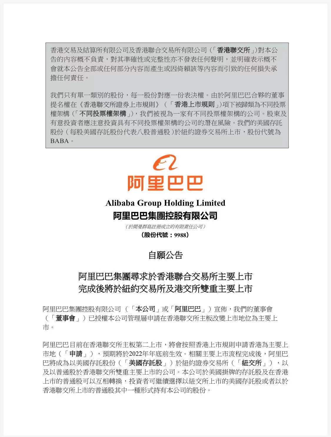 阿里巴巴目前在香港聯(lián)交所主板第二上市,將會按照香港上市規(guī)則申請香港為主要上市地,預(yù)期將于2022年年底前生效。相關(guān)主要上市流程完成后,阿里巴巴將成為以美國存托股份于紐約證券交易所,以及以普通股于香港聯(lián)交所雙重主要上市的公司。
