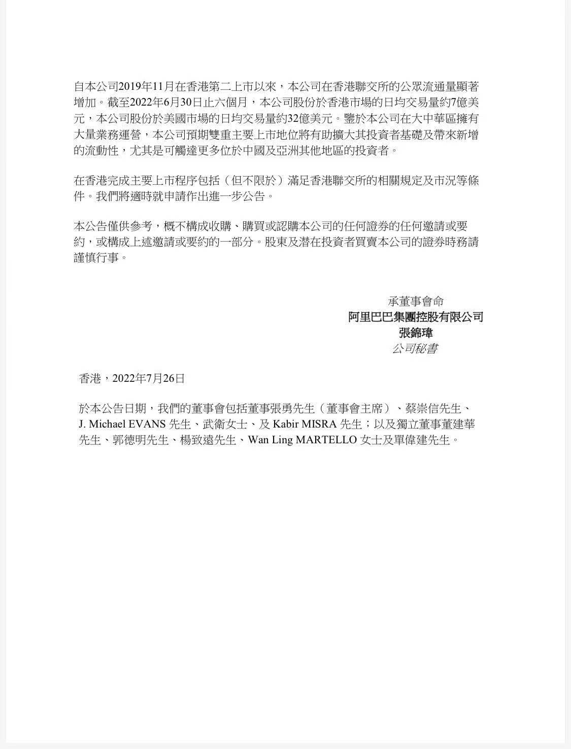 中新網(wǎng)7月26日電 阿里巴巴集團(tuán)控股有限公司7月26日在港交所發(fā)布公告,董事會已授權(quán)公司管理層申請?jiān)谙愀勐?lián)交所主板改變上市地位為主要上市。