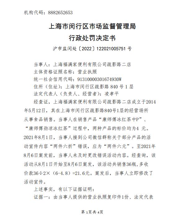 行政處罰決定書顯示,當(dāng)事人在銷售冰紅茶時,兩種產(chǎn)品的標(biāo)價均為4元。2021年8月1日,當(dāng)事人接到公司微信群稱關(guān)于部分產(chǎn)品的活動宣傳內(nèi)容“兩件六折”錯誤,應(yīng)為“兩件六元”。至2021年8月6日案發(fā)前,當(dāng)事人未及時更改錯誤活動內(nèi)容。經(jīng)查詢,該活動從8月1日開始至8月6日案發(fā),該活動共銷售36瓶,多收價款36÷2×(6-4.8)=21.6元。案發(fā)后,當(dāng)事人立即修改了活動宣傳。(中新財經(jīng))