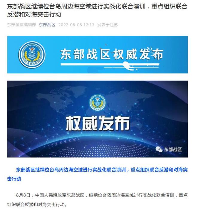 中新網(wǎng)8月8日電 據(jù)東部戰(zhàn)區(qū)微信公眾號(hào)消息,8月8日,中國(guó)人民解放軍東部戰(zhàn)區(qū)繼續(xù)位臺(tái)島周邊海空域進(jìn)行實(shí)戰(zhàn)化聯(lián)合演訓(xùn),重點(diǎn)組織聯(lián)合反潛和對(duì)海突擊行動(dòng)。