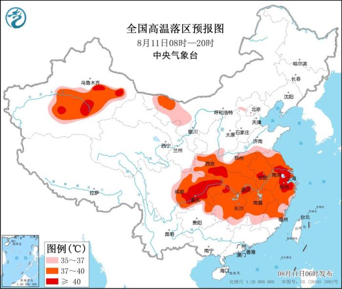 預(yù)計8月11日白天,新疆南疆盆地、內(nèi)蒙古西部、陜西中南部、河南中南部、安徽、江蘇、上海、四川中東部、重慶、湖北、湖南、江西、浙江、福建中北部、貴州北部等地有35~39℃高溫天氣,其中,陜西東南部、湖北西部和南部、四川東部、重慶、江蘇南部、安徽中部、浙江北部等地的部分地區(qū)可達40℃以上。中央氣象臺8月11日06時繼續(xù)發(fā)布高溫橙色預(yù)警。