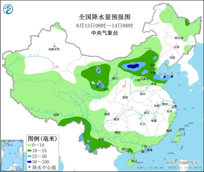 8月13日08時至14日08時,內(nèi)蒙古中西部、青海東北部、甘肅中部、華北中北部、山東中北部、云南南部等地部分地區(qū)有中到大雨,其中,內(nèi)蒙古中部、山東半島北部等地部分地區(qū)有暴雨(50~90毫米)。內(nèi)蒙古中部、新疆沿天山地區(qū)和南疆盆地等地部分地區(qū)有4~6級風(fēng)。