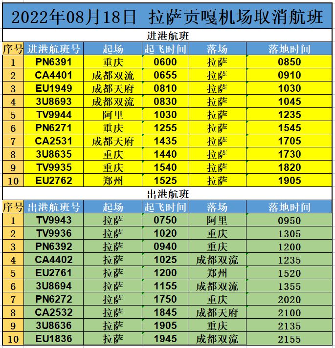 因公共安全原因,8月18日,拉薩貢嘎機(jī)場部分航班取消,計劃執(zhí)行進(jìn)出港航班18架次,分別為: