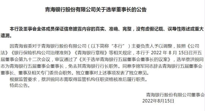 青海銀行主要負(fù)責(zé)人調(diào)整:選舉蔡洪銳為董事長(zhǎng)